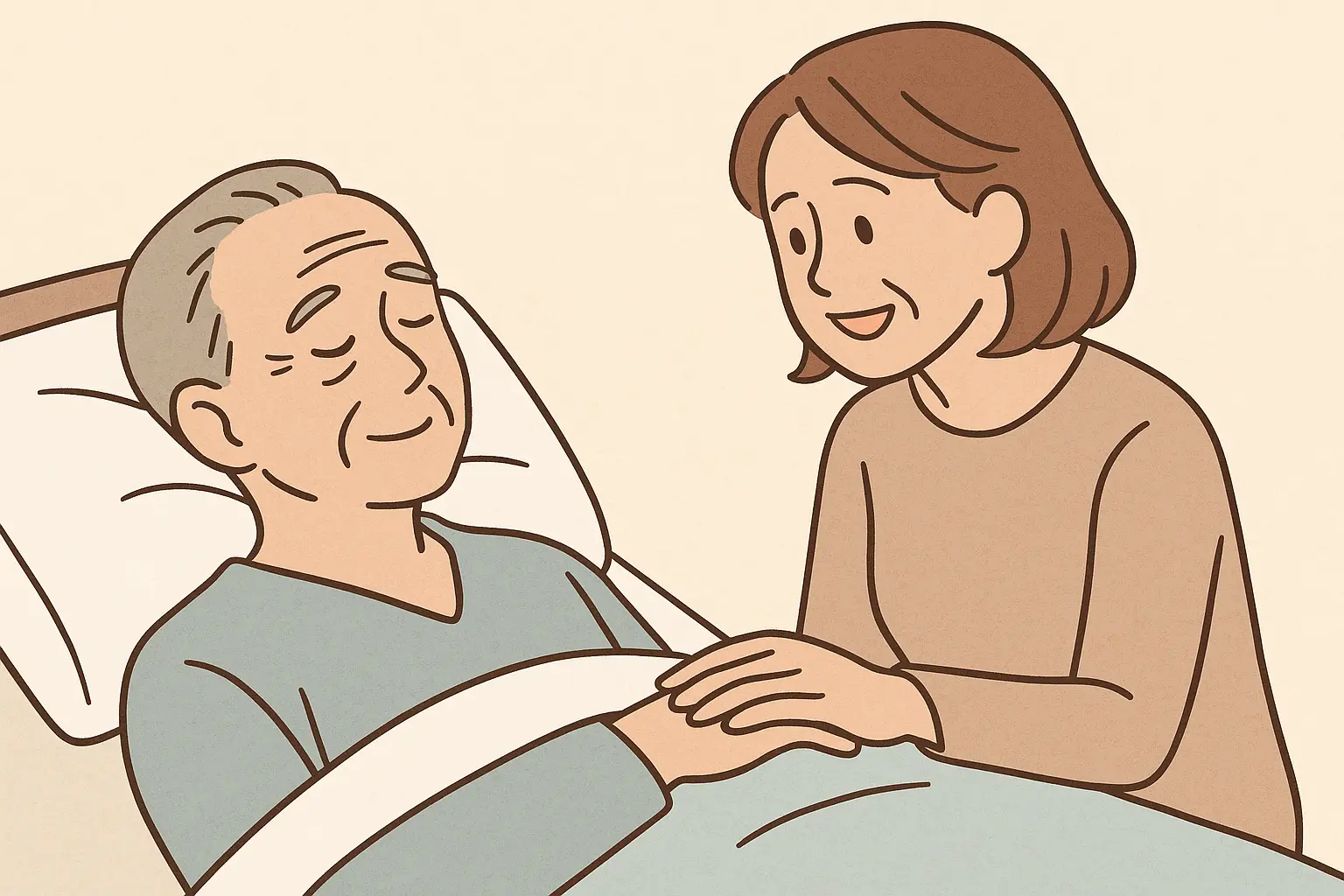 A. 無理に話さなくても構いません。そっと手を握る、穏やかな表情で寄り添うだけでも安心感を与えます。